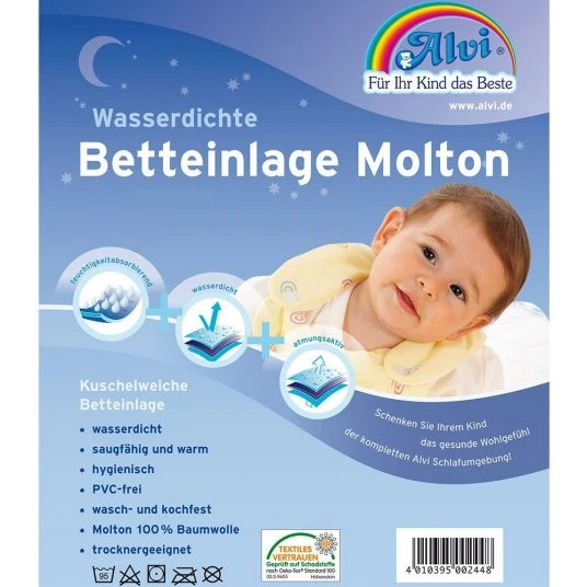 Die weiße Betteinlage Molton 50 x 70 cm von Alvi ist ein besonders saugstarker, warmer, wasserundurchlässiger und dabei atmungsaktiver Matratzenschoner. Du kannst die Einlage einfach über die Matratze Deines Kindes legen und das Spannbettlagen darüber anbringen. Die Betteinlage schützt die Matratze zuverlässig vor Nässe und dank der 2fachen Moltonbeschichtung kann sich Dein Liebling nicht wundliegen. Bei Bedarf lässt sich die Einlage ganz einfach bis 95 °C in der Maschine waschen und anschließend im Trockner trocknen – so ist sie im Handumdrehen wieder rundum hygienisch einsatzbereit.