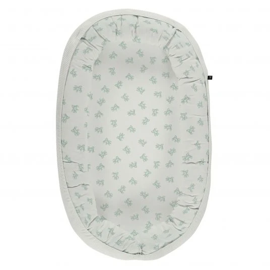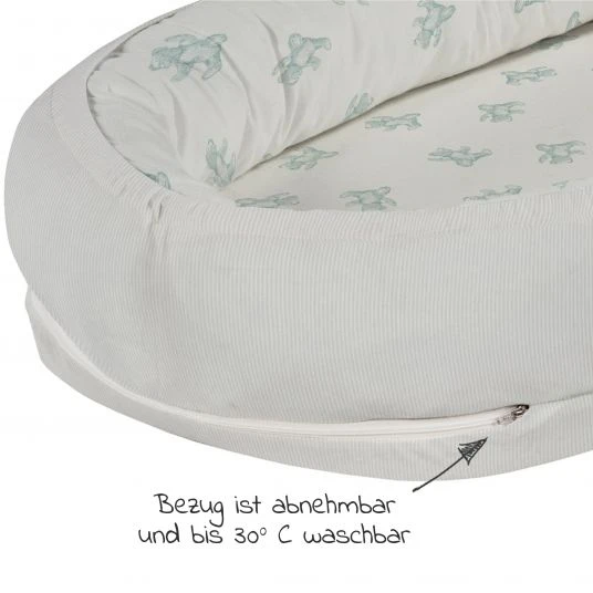 Die weiche, hohe Umrandung sorgt dafür, dass Dein kleiner Liebling sicher liegt und spendet ein Gefühl von Geborgenheit. Das bezaubernde Design Teddy 1961 in schönen Grüntönen mit süßer Teddy-Musterung lässt das Nestchen schnell zum besonderen Hingucker werden. Der Bezug besteht aus hautfreundlicher Bio-Baumwolle und ist zur zarten Babyhaut besonders sanft.