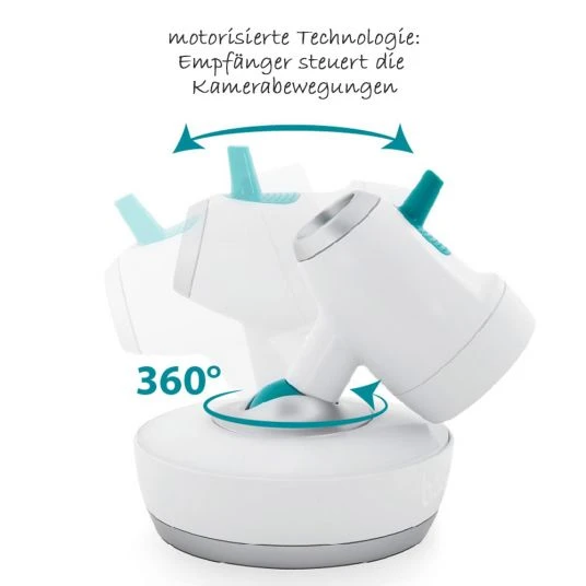 Das 360° drehbare Video-Babyphone YOO Moov von Babymoov hat eine vertikal und horizontal schwenkbare Kamera, die sich bequem mit der Elterneinheit fernsteuern lässt. Dank 2-facher Zoomfunktion, Nachtsicht und großem Bildschirm mit 11 cm Bilddiagonale hast Du Deinen kleinen Liebling also immer bestens im Blick. Die im Sockel verborgene Kamera ist sehr leistungsfähig und zugleich leise, um Deinen Schatz nicht zu wecken. Bei Veränderungen des Blickwinkels bleibt das Bild fließend und ruhig.