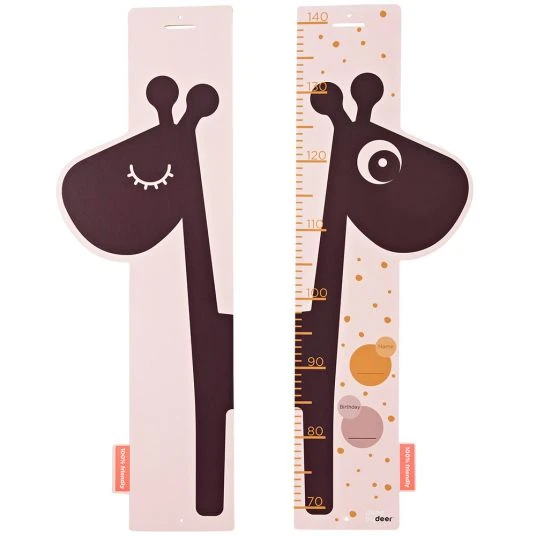 Nicht nur die Eltern, sondern auch die Kinder möchten gerne wissen, wie groß sie jetzt schon sind. Mit der Done by Deer Messlatte Raffi in Rosa lässt sich das ganz leicht herausfinden. Gemeinsam mit der niedlichen Giraffe macht das Messen besonders viel Spaß. Das genaue Ablesen der Größe klappt mit der großen Skala sehr einfach. Neben dem langen Giraffenhals befinden sich zwei Kreise: Hier können der Name und der Geburtstag Deines kleinen Schatzes eingetragen werden.