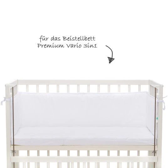 Das weiße Nestchen passend für Beistellbetten, z.B. das Premium Vario 3in1 von Fillikid verwandelt Dein Beistellbett in ein kuscheliges Schlafplätzchen. Zum Polstern der Gitterstäbe wird es einfach mit den Bindebändern am Bettchen befestigt. Das Nestchen besteht aus hautfreundlicher und atmungsaktiver Baumwolle.