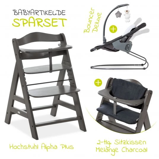 Jetzt exklusiv bei Babyartikel.de – das Alpha Deluxe Hochstuhl-Set ab der Geburt.4in1 Sparset: Inkl. Alpha Hochstuhl Charcoal aus der Selectline, Neugeborenenaufsatz Deluxe (Rückenlehne verstellbar), Babywippe sowie einer weichen 2- teiligen Sitzauflage.
