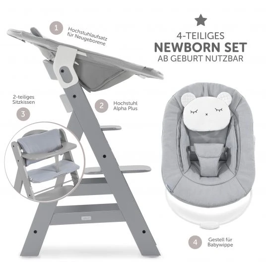 Jetzt exklusiv bei Babyartikel.de – das Alpha Hochstuhl-Set ab der Geburt.4in1 Paket: Inkl. Alpha Hochstuhl, Neugeborenenaufsatz und Babywippe sowie einem weichen Sitzpolster.