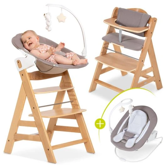 Jetzt exklusiv bei Babyartikel.de – das Alpha Deluxe Hochstuhl-Set ab der Geburt.4in1 Sparset: Inkl. Alpha Hochstuhl Natur, Neugeborenenaufsatz Deluxe (Rückenlehne verstellbar), Babywippe sowie einer weichen 2- teiligen Sitzauflage.