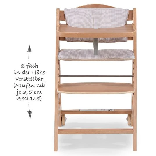 Eine Anpassung an die jeweiligen Wachstumphasen ist sehr einfach. Sitzfläche und Fußplatte sind verstellbar und können so an die verschiedenen Größen angepasst werden. Mit dem Hochstuhl Beta leistet Hauck einen Beitrag zum Umweltschutz: das verwendete Buchenholz stammt aus nachhaltig bewirtschaftetem und europäischem Anbau.