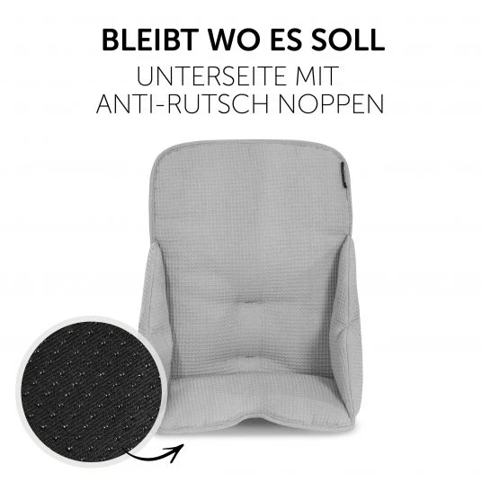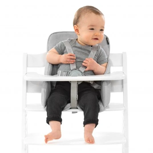 Der Sitzkomfort kommt dabei auch nicht zu knapp: Kuscheliger, angenehmer Baumwoll-Waffelpiqué mit atmungsaktiven und feuchtigkeitsregulierenden Eigenschaften bieten ein angenehmes Sitzgefühl. Die weiche Polsterung des Sitzverkleinerers macht den Hochstuhl besonders bequem.