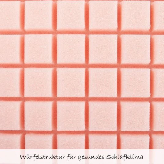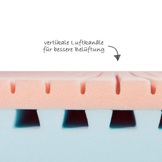 Vertikale Luftkanäle und eine Würfelstruktur im Matratzenkern sorgen für eine hervorragende Klimaregulierung. Diese Durchlüftung der Matratze sorgt ebenfalls dafür, dass das ausgeatmete CO2 und die abgegebene Körperwärme Ihres Babys gut abgeführt werden. Einem gefährlichen Wärmestau wird so vorgebeugt und es entsteht ein gesundes Schlafklima. Die Kleinsten liegen auf der Babyseite gut belüftet und superbequem. Kleinkinder schlafen ideal auf der festeren Juniorseite. Eine trittfeste Kante sorgt rundum im Randbereich dafür, dass Ihr Baby nicht mit seinem Köpfchen oder den Füßen zwischen Matratze und Gitterstäbe rutschen kann.