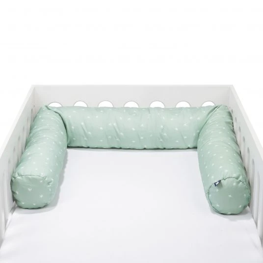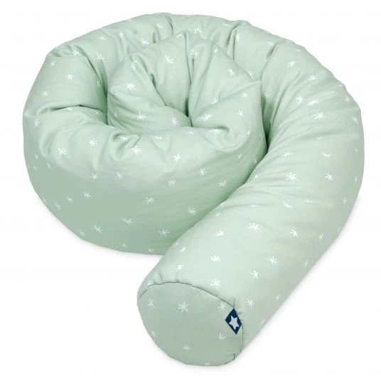 Die bauschige Füllung im Inneren macht sie angenehm weich. Damit es Dein Nachwuchs es in seinem Bettchen oder auch im Laufgitter so richtig gemütlich hat, begeistert die Nestchenschlange mit einer bezaubernden Optik: Das niedliche Muster mit Sternen und der sanfte Farbton lädt zum Träumen ein. Wird sie schmutzig, kannst Du sie einfach bei 40°C in der Maschine wieder zum strahlen bringen.