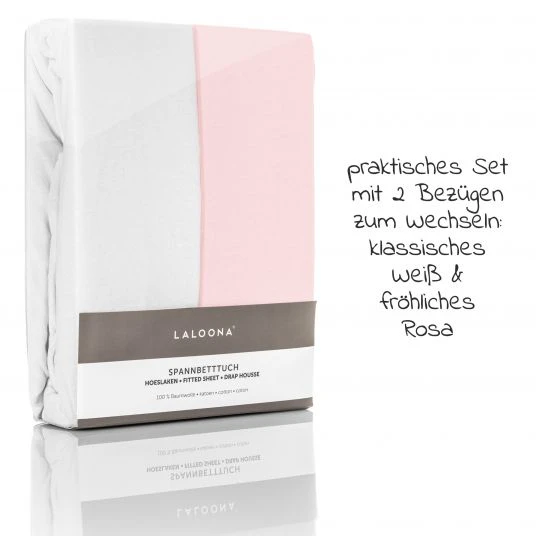 Die LaLoona Spannbetttücher Weiß Rosa im praktischen 2er Pack aus kuscheligem, atmungsaktivem Jersey bestehen aus 100% hautfreundlicher Baumwolle. Sie sind besonders sanft zur zarten Babyhaut und sorgen für Wohlbefinden und einen angenehmen Schlaf. Außerdem sind die Babybett Spannbetttücher von Laloona gleich für zwei Matratzen-Größen einsetzbar: 60 x 120 cm oder 70 x 140 cm. So sind sie universell einsetzbar und passen auch auf die nächstgrößere Matratze.
