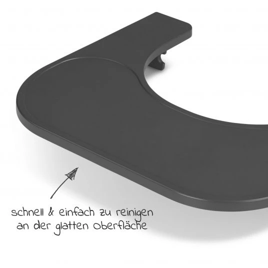Teller und Becher bleiben auf dem extra stabilen Tisch an Ort und Stelle. Auch zum Spielen bietet er sich an, wilde Trommelspiele können dem robusten Tisch nichts anhaben. Geht während den Mahlzeiten etwas daneben, lässt sich die glatte Oberfläche mit einem feuchten Tuch einfach abwischen.