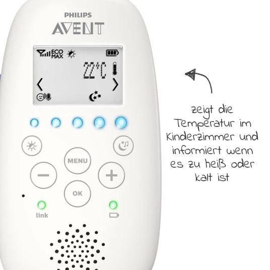Mit fünf Geräuschpegel-Leuchten am Empfänger siehst Du auf einen Blick, ob Dein Baby Geräusche macht, selbst wenn die Elterneinheit stummgeschaltet ist. Ob Eltern- und Babyeinheit miteinander verbunden sind und ob der Akku ausreichend geladen ist, wird Dir ebenfalls über Kontrollleuchten angezeigt. Auf dem Display siehst Du außerdem die aktuelle Temperatur im Kinderzimmer. Ein Alarm informiert Dich, wenn eine von Dir vorher festgelegte Temperatur über- oder unterschritten wird.