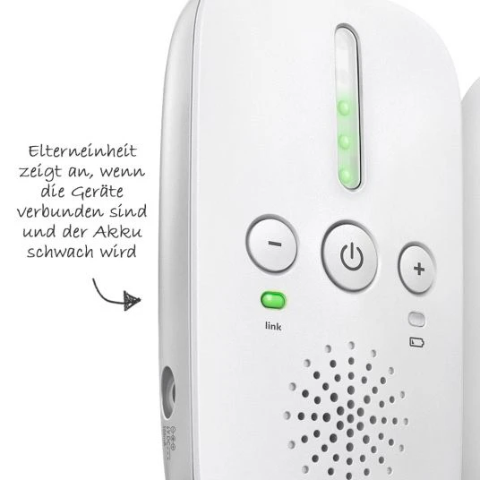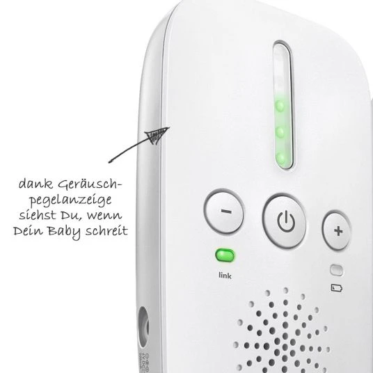 Mit der Geräuschpegelanzeige am Empfänger siehst Du auf einen Blick, ob Dein Baby Geräusche macht, selbst wenn die Elterneinheit stummgeschaltet ist. Ob Eltern- und Babyeinheit miteinander verbunden sind, wird Dir ebenfalls über eine Kontrollleuchte angezeigt. Sobald der Akku der Elterneinheit schwach wird, leuchtet eine weitere Warnanzeige auf und informiert Dich darüber. Das Nachtlicht an der Babyeinheit ist angenehm warm und sanft, um Dein Baby in der Nacht zu beruhigen.