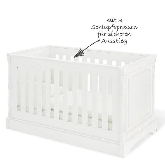 Ein toller Ort zum Träumen und Entspannen ist das weiße Bett, das dank der verstärkten Seitenteile besonders stabil und standfest ist. Der Lattenrost ist aus Massivholz gefertigt und lässt sich 3-fach in der Höhe von 16 auf 32 und weiter auf 44 cm verstellen. Wenn Dein Baby noch klein ist, eignet sich vor allem eine höhere Position, damit Du es bequem und rückenschonend in das Bettchen hineinlegen und wieder herausheben kannst. Sobald Dein Kleines älter wird, verstellst Du den Lattenrost weiter nach unten. Dank der 3 Schlupfsprossen entsteht eine praktische Öffnung, durch die Dein Kind sein Bett nun selbstständig verlassen kann – und das ganz ohne abenteuerliche Kletterpartien.