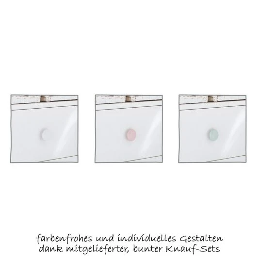 Die breite Wickelkommode Florentina von Pinolino ist mehr als ein gutaussehender Aufbewahrungsort für Kleidung. Dank des praktischen Wickelaufsatzes kannst Du Dein Baby auf der Kommode sicher und in bequemer Höhe wickeln. Sie hat ein großes, offenes Fach in das Du auch gegebenenfalls Körbe (separat erhältlich) reinstellen kannst um kleinere Sachen zu lagern. Die 2 Schubkästen bieten Dir sehr viel Platz für Windeln und Kleidung Deines kleinen Schatzes. Die Schubladen lassen sich leichtgängig herausziehen und hineinschieben. Zur individuellen farblichen Gestaltung liegen der Wickelkommode 3 verschiedenfarbige (Weiß, Rosa und Mint) Knopfsets bei. Der Wickelaufsatz kann einfach abgenommen werden. Nach der Windelzeit kannst Du so die Kommode als geräumiges Sideboard nutzen. Praktisch ist auch der große Abstand zwischen dem Fußboden und dem Boden der Kommode. So kannst Du leicht untendrunter wischen und hast schnell ein sauberes Kinderzimmer.