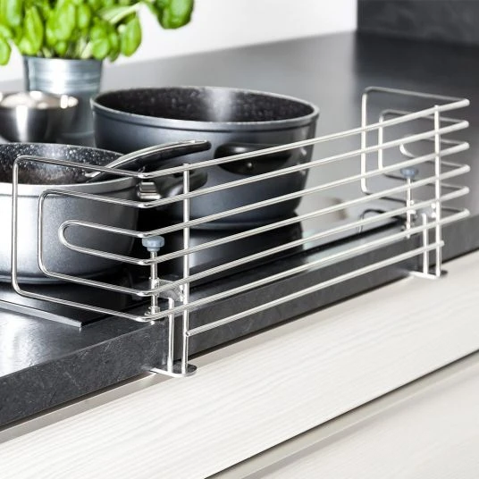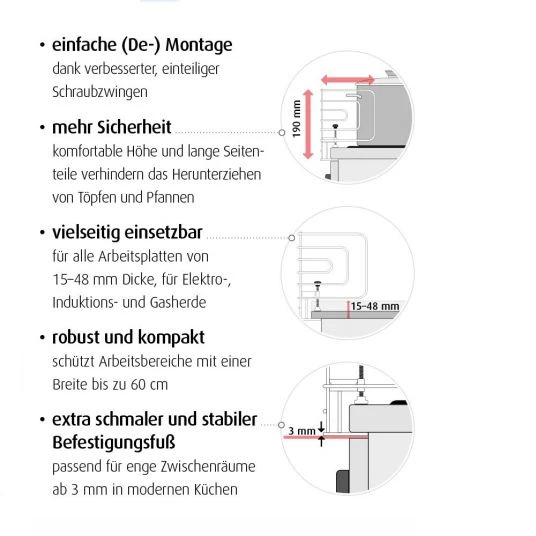 Das Herdschutzgitter Edelstahl von Reer verhindert schmerzhafte Verbrennungen. Dank der einteiligen Schraubzwingen ist es schnell und ohne Bohren oder Schrauben montiert und verhindert, dass Ihr Kleines an die heißen Töpfe und Herdplatten greift. Es eignet sich für alle Arbeitsbereiche bis zu einer Länge von 60 cm und schützt dank der Seitenflügel auch vor seitlichem Hineingreifen. Der extraschmale Befestigungsfuß passt auch in enge (ab 3mm) Zwischenräume und kann an Arbeitsplatten mit einer Dicke von 15-48 mm fixiert werden. Das Gitter ist aus rostfreiem Edelstahl und kann in der Spülmaschine gereinigt werden.