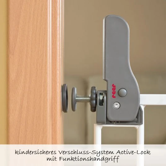 Dank des kindersicheren Active-Lock-Systems bleibt die volle Durchgangsbreite erhalten und Sie werden in Ihrer Bewegungsfreiheit nicht eingeschränkt. Mit Hilfe eines praktischen Funktionshandgriffs können Sie das Schutzgitter ganz einfach mit einem Handgriff öffnen. Wenn Sie das Gitter als Schraubgitter nutzen, entsteht ein praktisches Schwenkgitter, das in beide Richtungen geöffnet werden kann.