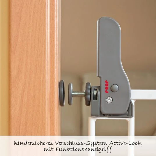 Dank des kindersicheren Active-Lock-Systems bleibt die volle Durchgangsbreite erhalten und Sie werden in Ihrer Bewegungsfreiheit nicht eingeschränkt. Mit Hilfe eines praktischen Funktionshandgriffs können Sie das Schutzgitter ganz einfach mit einem Handgriff öffnen und in beide Richtungen schwenken.
