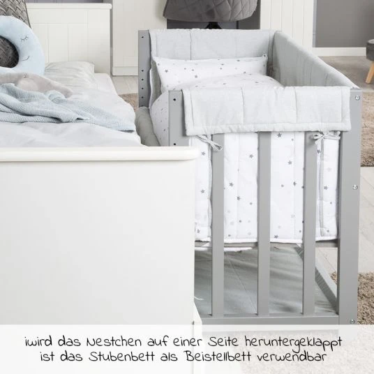 Zusätzlich zum 3 in 1 Stubenbett ist noch einiges an Zubehör im Lieferumfang enthalten: eine Matratze, eine Himmelstange, ein hübscher Himmel, ein gepolsterter Einhang, Kopfkissen (Inlett), Decke (Inlett) und ein 2 tlg. Bettwäsche-Set im Design Sternenzauber Grau sorgen für traumhafte Stunden. So schläft Dein Baby von Anfang an in einer wohligen, kuscheligen Umgebung.