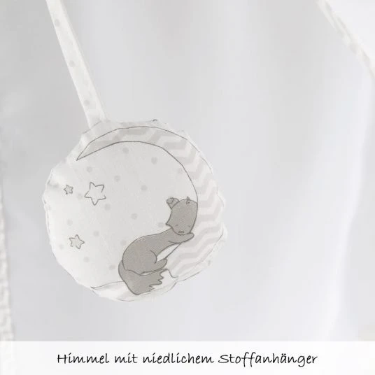 Mit dabei in diesem tollen Komplett-Set sind außerdem eine antiallergische Matratze mit abnehmbaren Bezug, ein Himmelhalter und ein Himmel mit Spielelement. Zusätzlich dazu sind ein gepolstertes Nestchen und ein Bettbezüge-Set im niedlichen Design Fox & Bunny im Lieferumfang enthalten.