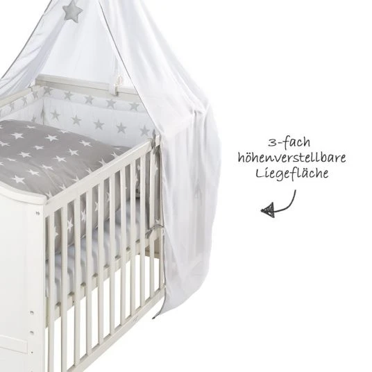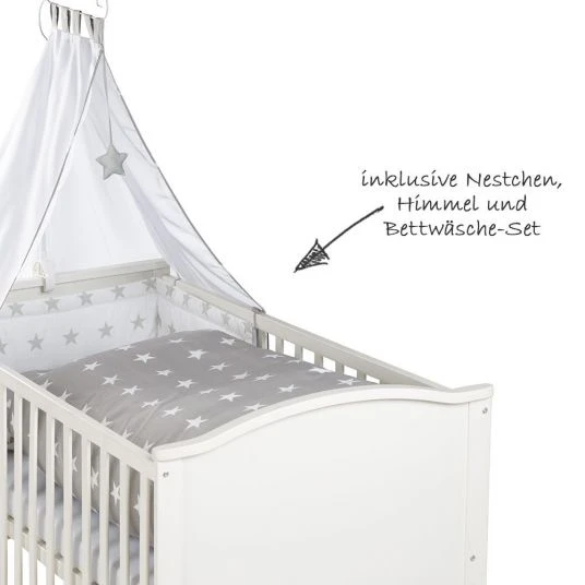 Mit dabei in diesem tollen Komplett-Set sind außerdem eine antiallergische Matratze mit abnehmbaren Bezug, ein Himmelhalter und ein Himmel mit Spielelement. Zusätzlich dazu sind ein gepolstertes Nestchen und ein Bettbezüge-Set im niedlichen Design Little Stars im Lieferumfang enthalten.