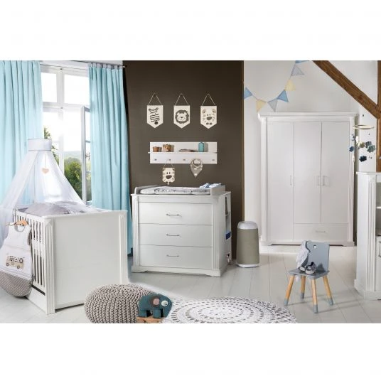 Das Zimmer besteht aus einem komfortablen Babybett, einer Wickelkommode und einem großem 3-türigen Kleiderschrank mit 1 Schublade.