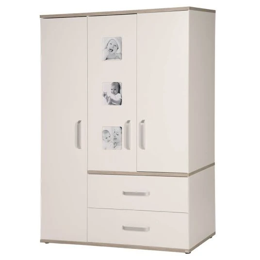 Der helle Schrank ist mit drei tollen Bilderrahmen (19×19 cm) versehen, die Ihnen eine ganz indivuelle Kinder- und Jugendzimmer-Gestaltung ermöglichen. Hinter den drei weißen Türen bietet er Ihrem Nachwuchs jede Menge Platz für Kleidung und mehr. Im linken, schmaleren Teil des Schrankes befinden sich fünf Fächer. Die rechte, größere Seite ist dagegen mit zwei Fächern und einer Kleiderstange ausgestattet. Insgesamt sind drei der Einlegeböden flexibel versetzbar. Für zusätzlichen Stauraum sorgen außerdem zwei Schubladen.