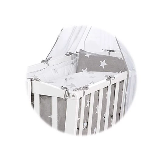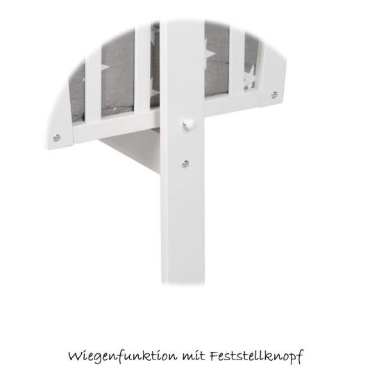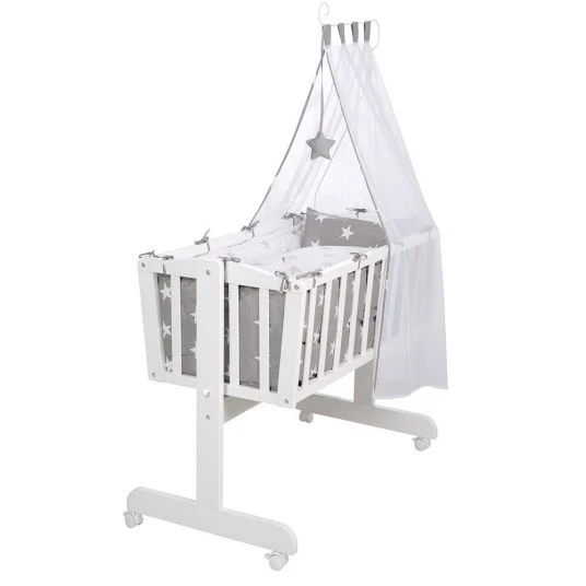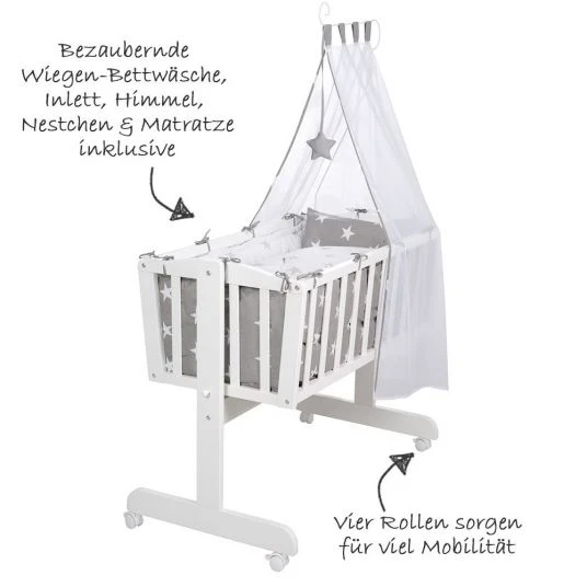 Neben der Wiege sind Matratze, Bettwäsche, Nestchen, Baby-Inlett-Set, Himmel mit Himmelstange sowie ein Spielelement im Lieferumfang enthalten. Das niedliche Little-Stars-Design auf den Textilien peppt zusätzlich auf und überzeugt dabei auf der ganzen Linie bei Groß und Klein. Dabei ist das pflegeleichte Set aus 100% Baumwolle besonders angenehm auf Babys Haut. Das Nestchen ist mit weichem Polyester-Vlies gefüllt und polstert die Gitterstäbe rundherum ab. Auf der bequemen Vliesmatratze wird Ihr Schatz nicht nur süß träumen.