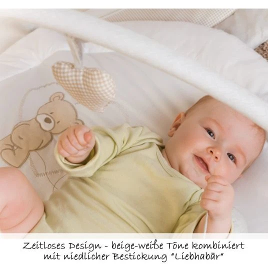 Die kuschelige Bettgarnitur inkl. Himmel in sanften beige-weißen Farbtönen ist mit dem niedlichen Bärenmotiv „Liebhabär“ bestickt und lädt zum Kuscheln ein. Ihr kleiner Liebling hat in dieser als Beistell-, Stuben- oder Babybett genutzten Schlafstätte die süßesten Träume.