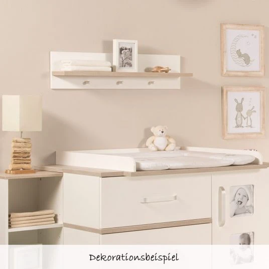 Die Wandgarderobe Moritz Baby und Olaf von Roba bietet Ihnen eine weitere Ablagefläche im Kinderzimmer und ist außerdem mit drei praktischen Haken versehen. Hier können Sie die Jacken Ihres Sprösslings aufhängen; während Mützen und Handschuhe ihren Platz auf der Ablagefläche finden. So haben Sie immer alles griffbereit und gleichzeitg gut aufgeräumt.