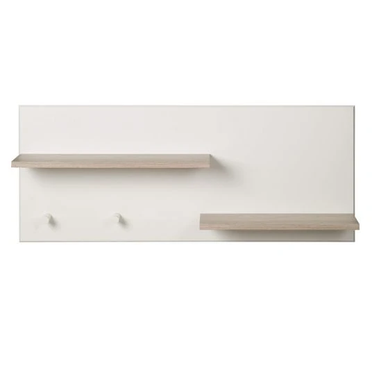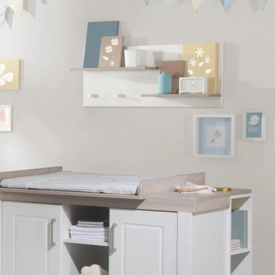 Das Wandregal Felicia von Roba ist mit zwei Ablagen und zwei Garderobenhaken die perfekte Ergänzung für die Wickelkommode. Die Rückwand im Dekor Canadian White und die Ablagen im Dekor Luna Elm sehen besonders schick und modern aus. Auf den beiden Ablageflächen kannst Du Deko-Gegenstände und Pflegeutensilien, die Dein Baby nicht erreichen soll, abstellen. An den Haken lassen sich wunderbar Waschlappen und Handtücher griffbereit aufhängen.