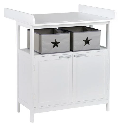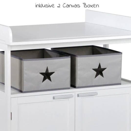 In den beiden Canvas-Boxen im offenen Fach zwischen der Wickelfläche und den 2 Türen hast Du bei der Babypflege alles schnell griffbereit. Hinter den beiden Türen mit modernen silbernen Griffen bietet sich Stauraum mit einem Einlegeboden für Wickelutensilien und Kleidungsstücke.