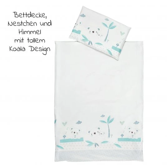 Damit Dein Kleines nachts erholt schlafen und seine vielen Eindrücke des spannenden Tages verarbeiten kann, muss es sich in seinem Bettchen geborgen fühlen. Das kuschelige, 4-tlg. Schardt Bettwäsche-Set Koala mit einem Deckenbezug von 100 x 135 cm, einem Kissenbezug mit 40 x 60 cm, einem Nestchen und einem Himmel bietet ihm einen herrlich angenehmen Schlafkomfort.