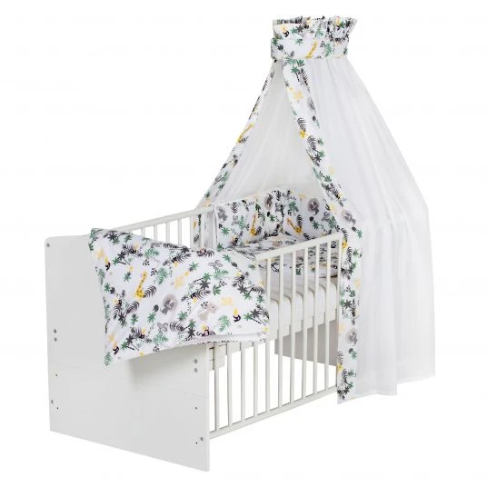 Damit sich Dein Nachwuchs rundum wohl fühlt, ist das Bett mit einer kuscheligen Decke und einem flauschigen Kissen ausgestattet. Das weiche Nestchen im dazu passenden Muster Jungle sorgt dafür, dass er sich sein Köpfchen an den Bettstäben nicht stoßen kann.