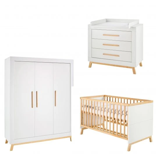 Das 16-teilige Kinderzimmer Miami White von Schardt besticht mit skandinavischem Design in seidenmattem Weiß und Massivholzelementen aus Buche. Besondere Hingucker sind die Füße, Möbelgriffe und Gitterseiten aus massivem und geöltem Buchenholz. Diese bilden einen schönen Kontrast zu den weißen Melamin Fronten. Das Set besteht aus einem 3-türigen, geräumigen Kleiderschrank, einem Kinderbett mit Umbauseiten, einer Wickelkommode, einem Wandboard, 2-tlg Bettwäsche, einem Nestchen, einem Kopfkissen, einer Bettdecke, einer Matratze, einem Spannbetttuch, einem Himmel, einer Himmelstange, einer Wickelauflage und zwei Umbauseiten für das Babybett. Die Wickelkommode lässt sich dank abnehmbarer Wickelauflage später auch als praktisches und schickes Sideboard verwenden.