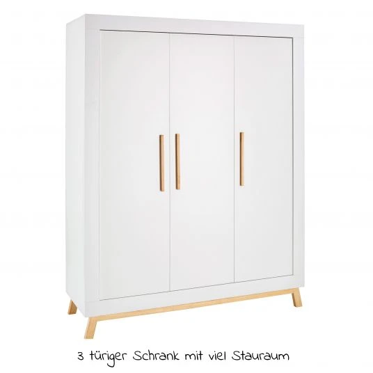 Der Kleiderschrank Miami White bietet hinter 3 Türen auf insgesamt 8 Fächer viel Platz für Babys Kleidung. Ein optisches Highlight stellen die Möbelfüße und die Möbelgriffe aus massivem und geöltem Buchenholz dar Auf einer Kleiderstange lassen sich Schlafsack, Babyjacke oder Kleidchen knitterfrei und gut erreichbar aufhängen. Auf 2 langen und 4 kurzen Regalböden findet zusammengelegte Kleidung Platz. Die Türen sind mit Soft-Close-System mit extra starken seitlichen Führungsschienen ausgestattet. Das heißt, kleine Finger werden nicht so leicht eingeklemmt und die Schranktüren schließen sanft und geräuscharm.