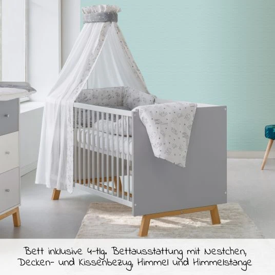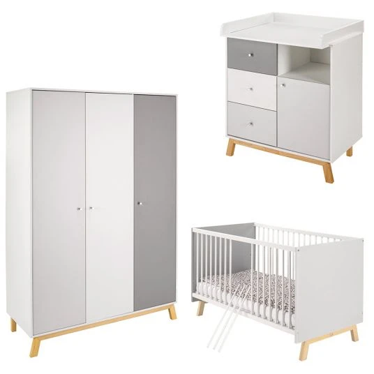 Das 16-teilige Kinderzimmer Vegas von Schardt besticht mit frischem, hellem Design in seidenmattem Weiß und hellen Grautönen und Massivholzelementen aus Buche. Besondere Hingucker sind die Füße aus massivem und geöltem Buchenholz. Diese bilden einen schönen Kontrast zu den weiß und Grauen Melamin Fronten. Das Set besteht aus einem 3-türigen, geräumigen Kleiderschrank, einem Kinderbett mit Umbauseiten, einer Wickelkommode, einem Wandboard, 2-tlg Bettwäsche, einem Nestchen, einem Kopfkissen, einer Bettdecke, einer Matratze, einem Spannbetttuch, einem Himmel, einer Himmelstange, einer Wickelauflage und zwei Umbauseiten für das Babybett. Die Wickelkommode lässt sich dank abnehmbarer Wickelauflage später auch als praktisches und schickes Sideboard verwenden.