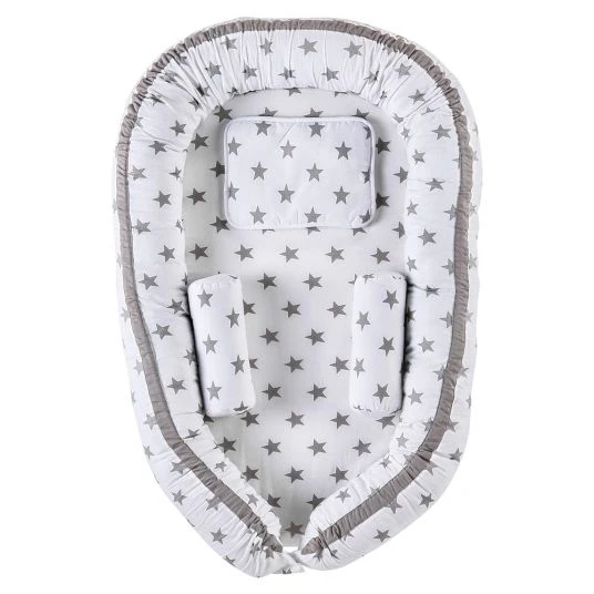 Im Kuschelnestchen – Big Stars – Grey von Schardt liegt Dein Baby geborgen und bequem. Ein Kopfkissen und 2 weiche Seitenrollen sorgen für zusätzliche Stabilität beim Liegen, während Dein kleiner Schatz viel Bewegungsfreiheit hat. So kann Dein Baby gemütliche Stunden im Elternbett oder auf dem Sofa verbringen. Die komfortable Matratze lässt sich herausnehmen und das Nestchen kann bequem in der Waschmaschine gereinigt werden. Der hübsch bedruckte Oberstoff besteht aus reiner, hautfreundlicher Baumwolle.