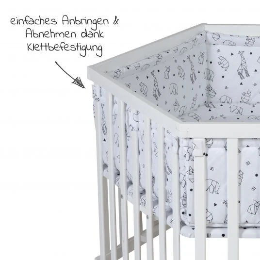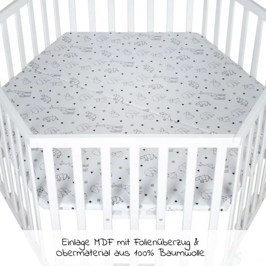 Im Laufgitter 6-eckig Solitär Weiß inkl. Einlage Origami Black von Schardt kann Dein Kleines entspannt spielen und zwischendurch auch ein Schläfchen halten. Dank der niedlichen Schutzeinlage mit den Origami Tieren ist es kuschelig weich gepolstert. Die Schutzeinlage hält mit Hilfe von Klettverschlüssen. Muss sie gewaschen werden, lässt sie sich so einfach entfernen und wieder anbringen.