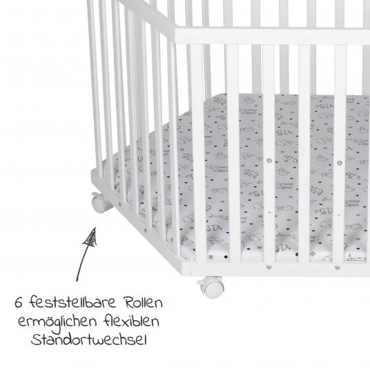 Das Laufgitter lässt sich 2-fach in der Höhe verstellen und ist damit sowohl für Kleinkinder als auch für Babys gut geeignet. Solange sich Dein Kind noch nicht hochziehen kann, ist die obere Stufe ideal. So schonst Du beim Hinein- und Herausheben Deinen Rücken. Die untere Stufe bietet Sicherheit für Krabbelkinder und Laufanfänger. Dank 6 praktischer Rollen lässt sich das Laufgitter flexibel von einen Raum in den anderen Schieben, so hast Du Deinen kleinen Weltentdecker immer im Blick.