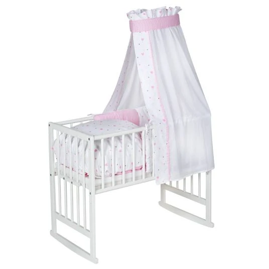 Kuschelweich und extra gemütlich wird die Multifunktionswiege durch den romantischen, schleierartigen Himmel, das weiche Nestchen und die wunderschöne Bettwäsche im Design Herzchen Rosa