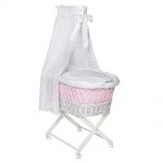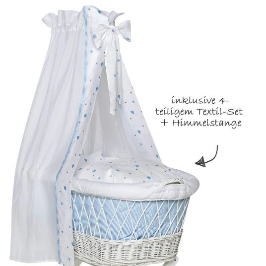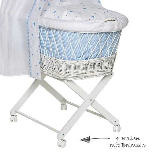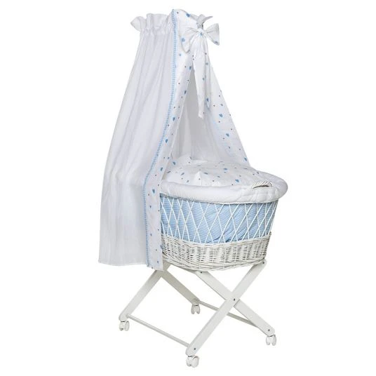 Der edle Stubenwagen besteht aus einem Gestell aus massiver Buche und einem 90 x 55 cm großen Weidenkorb. Mit 4 bremsbaren Rollen kannst Du den Wagen bequem von Raum zu Raum schieben – so hast Du Dein Baby immer in Deiner Nähe. Für einen sicheren Stand sind alle vier Rollen feststellbar. Der Weidenkorb wird durch eine Matratze und einem niedlich bedruckten Nestchen gepolstert, damit sich Dein Baby nicht verletzen kann und es kuschelig weich hat. Die Bezüge für Kissen und Decke sind aus hautfreundlicher Baumwolle und ebenfalls mit blauen Herzchen bedruckt. Den hübschen Himmel mit großer Schleife kannst Du an der ca. 70 cm langen Himmelstange befestigen und so im Nu eine wohlige Atmosphäre für Dein Kleines schaffen.
