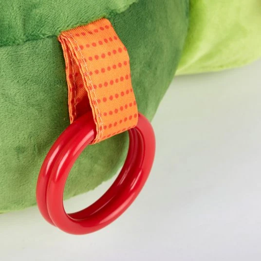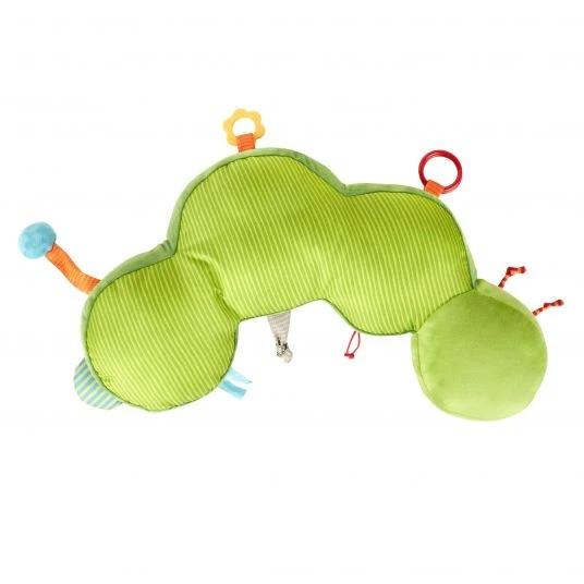 Eine Rassel, eine Quietsche und das Knisterpapier fördern den jungen Gehörsinn. Die tollen Farben und Muster motivieren zum Betrachten und Berühren, die Beißring-Blume bietet sich zur Linderung der Schmerzen während dem Zahnen an. Ein weiterer roter Ring will ausgiebig erkundet werden. Währenddessen kann sich Dein Baby jederzeit bequem am flauschig weichen Krabbeltier abstützen und trainiert ganz nebenbei seine Nacken- und Bauchmuskulatur.